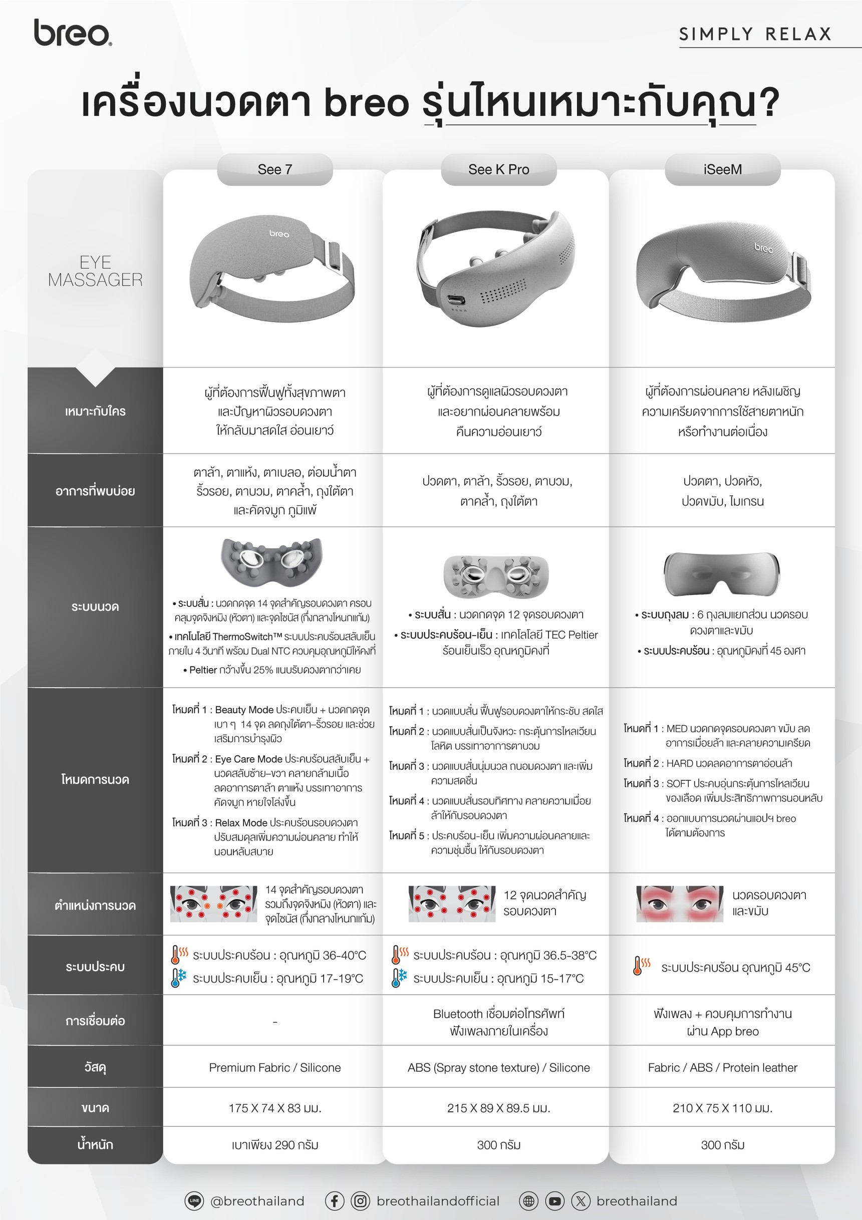 ในยุคที่คนทำงานใช้หน้าจอนานกว่า 8–12 ชั่วโมงต่อวัน งานวิจัยพบว่า กว่า 68% ของคนวัยทำงานมีอาการตาล้า ปวดขมับ หรือปวดศีรษะจากการใช้สายตาอย่างต่อเนื่อง เพราะฉะนั้น… การดูแลดวงตาในทุก ๆ วัน จึงสำคัญไม่แพ้การดูแลร่างกายส่วนอื่น breo See7 เครื่องนวดตาประร้อน-เย็น ระดับพรีเมียม ที่ผสานเทคโนโลยีบำบัดดวงตาแบบองค์รวม เพราะปัญหาดวงตาไม่ใช่แค่ความล้า แต่เกี่ยวพันถึงคุณภาพการนอน ความเครียด และปัญหาผิวรอบดวงตา breo See7 จึงออกแบบมาเพื่อดูแลครบทุกมิติ 14 Independent Vibration Nodes – นวดกดจุดเสมือนปลายนิ้วผู้เชี่ยวชาญ breo See7 ออกแบบหัวนวด 12 จุด +2 หัวนวดพิเศษ ตามหลักสรีรศาสตร์ นวดกดจุดบนจุดสำคัญรอบดวงตาได้อย่างแม่นยำ และรวมถึงจุดหัวตา-ต่อมนำ้ตา (จุดจิงหมิง) จุดฝังเข็มรอบเบ้าตา และจุดกึ่งกลางโหนกแก้ม (จุดไซนัส) ที่เชื่อมโยงกับระบบประสาทและการไหลเวียนเลือดรอบดวงตา คลายความปวดตึงได้ล้ำลึกเสมือนนวดด้วยปลายนิ้วจากผู้เชี่ยวชาญโดยเฉพาะ