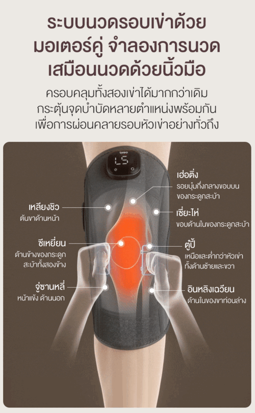 เข่า คือข้อต่อที่ทำงานหนักที่สุดในร่างกาย รองรับทุกการเคลื่อนไหว ทุกก้าวเดิน เมื่ออายุมากขึ้น ใช้งานหนัก หรืออยู่ในท่าเดิมนาน ๆ ความเมื่อยตึง เจ็บลึกในข้อเข่า กลายเป็นอาการที่รบกวนทุกวัน ไม่ว่าจะเป็นอาการปวดจากการยืน เดิน วิ่ง หรือออกกำลังกายหนักเป็นประจำล้วนเกิดจากกล้ามเนื้อรอบเข่าที่อ่อนล้าและไหลเวียนเลือดไม่ดี เทคโนโลยี Dual-Wave Heating Therapy การบำบัดด้วยความร้อนและระบบนวดรอบเข่าด้วยมอเตอร์คู่จำลองการนวดเสมือนมือนวดครอบคลุมทั้งสองเข่าได้มากกว่าเดิมกระตุ้นจุดบำบัดหลายตำแหน่งพร้อมกันเพื่อการผ่อนคลายรอบหัวเข่าอย่างทั่วถึง